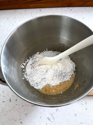 - 麵粉、泡打粉、鹽過篩,加入黑芝麻粉,全數倒入作法 5 中,用橡皮刮刀攪拌均勻無粉粒。